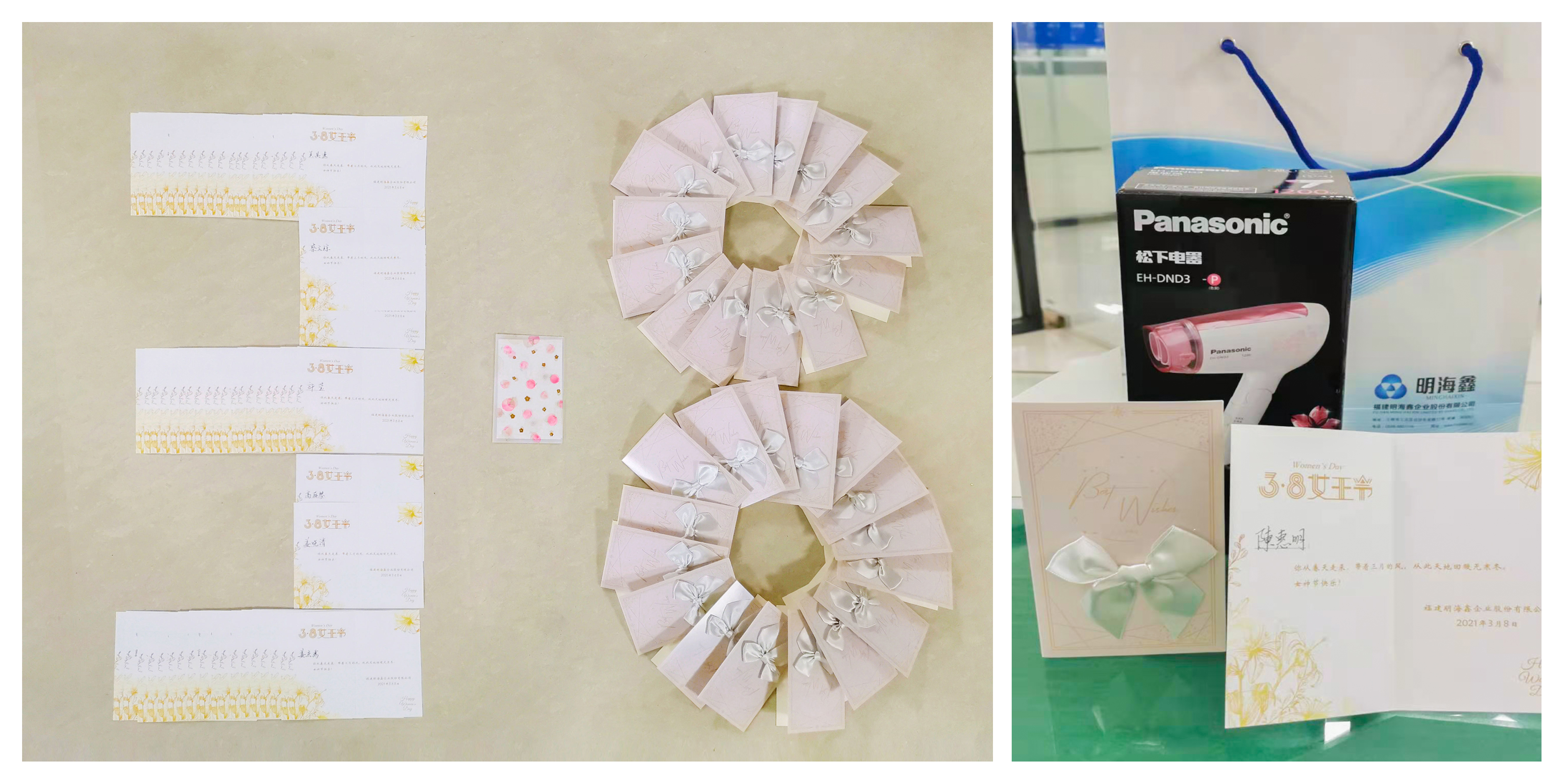 昨晚公司辦公室人員就在女神們的辦公桌上放好小禮品,一早大家到公司上班紛紛被驚喜到,打開一看,是一款大功率的護發吹干機,還附帶一張“3.8 女王節”的手寫小賀卡,特別的暖心,感受到公司對女員工濃濃的關愛。