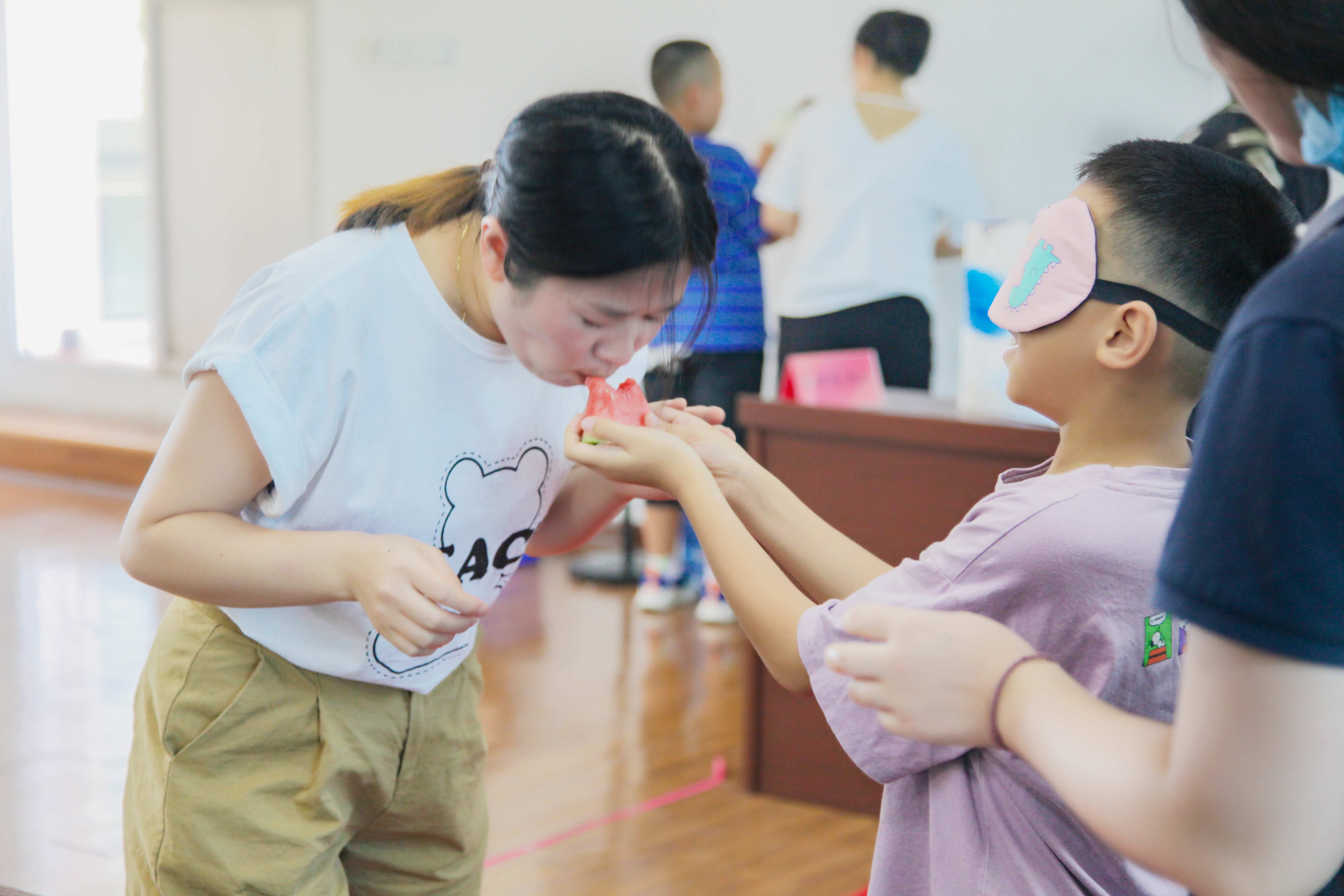“蒙眼吃西瓜”游戲輕松快樂,孩子們蒙著眼睛,憑感覺尋找父母嘴巴的位置,并喂食西瓜,這項游戲很好地增進(jìn)了親子之間的感情。
