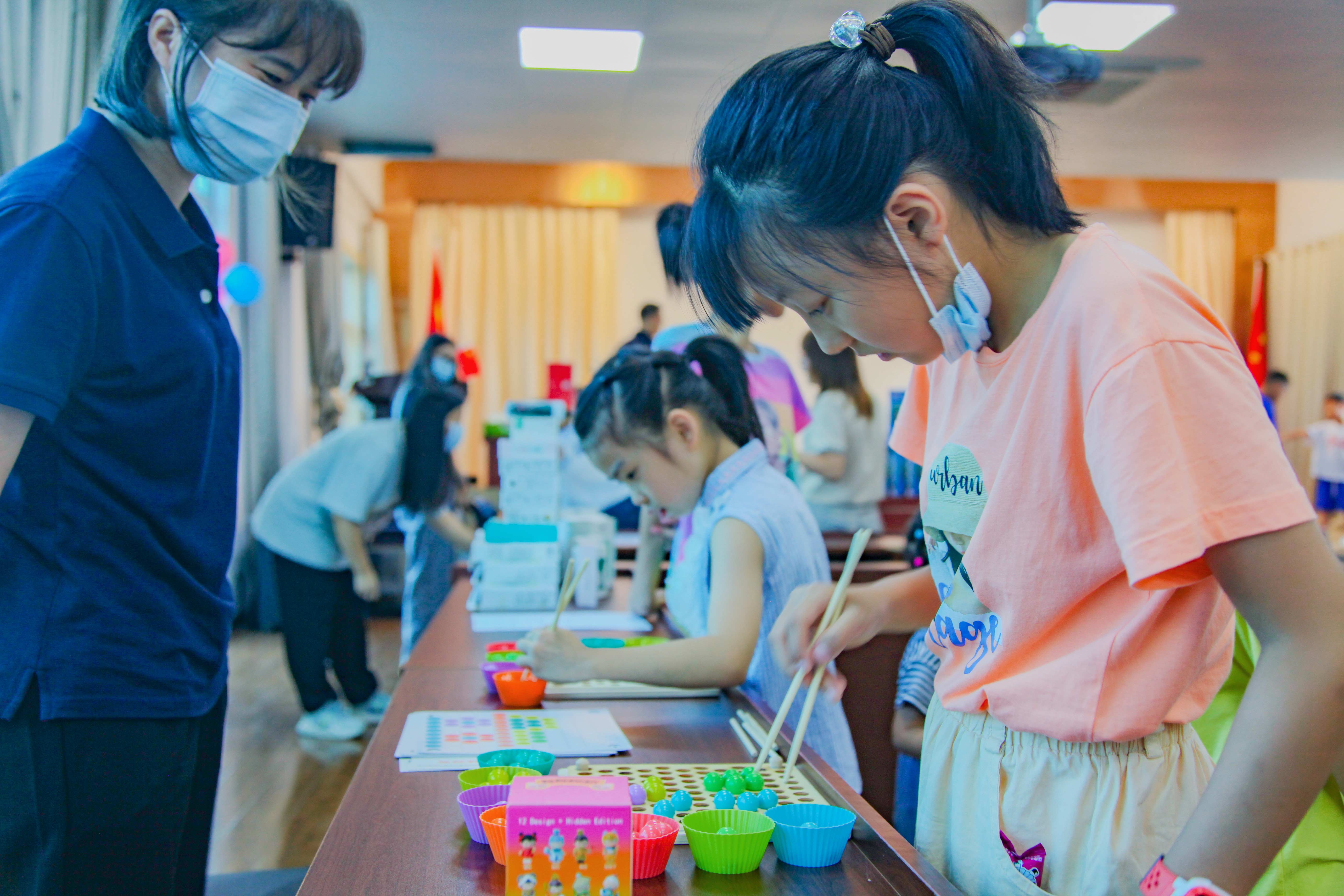 “夾彈珠”游戲考驗的是協(xié)調(diào)力和專注力。對于孩子們來說,熟練地使用筷子已經(jīng)是一大挑戰(zhàn),用筷子夾起圓滑的彈珠更是不易。和其他游戲場地的熱烈氣氛不同,“夾彈珠”區(qū)域最為安靜嚴(yán)肅。